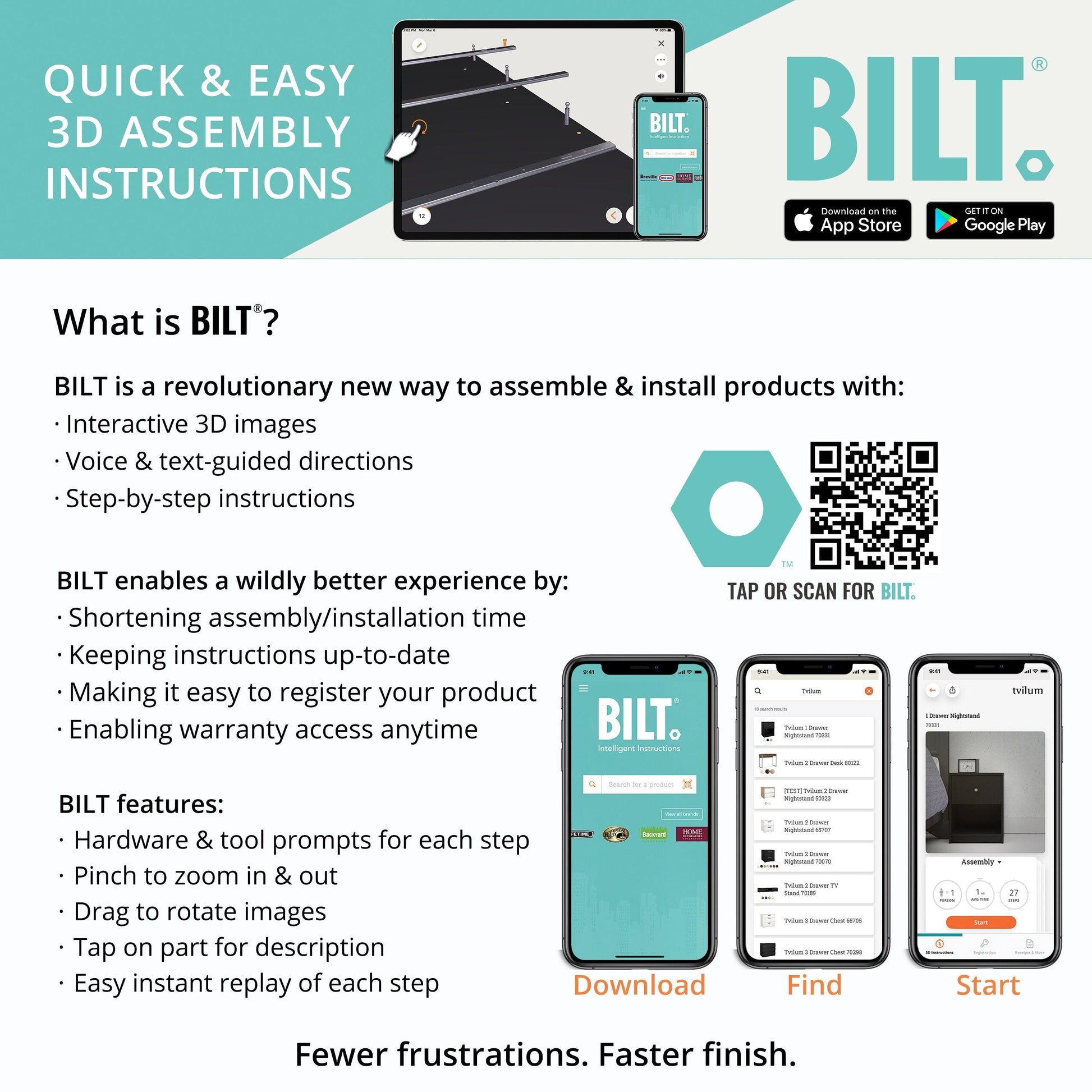 • 3D Interactive assembly through BILT: Instructions for this product are available through the free BILT app. Find a revolutionary way to assemble & install product with voice, text, & interactive animated images