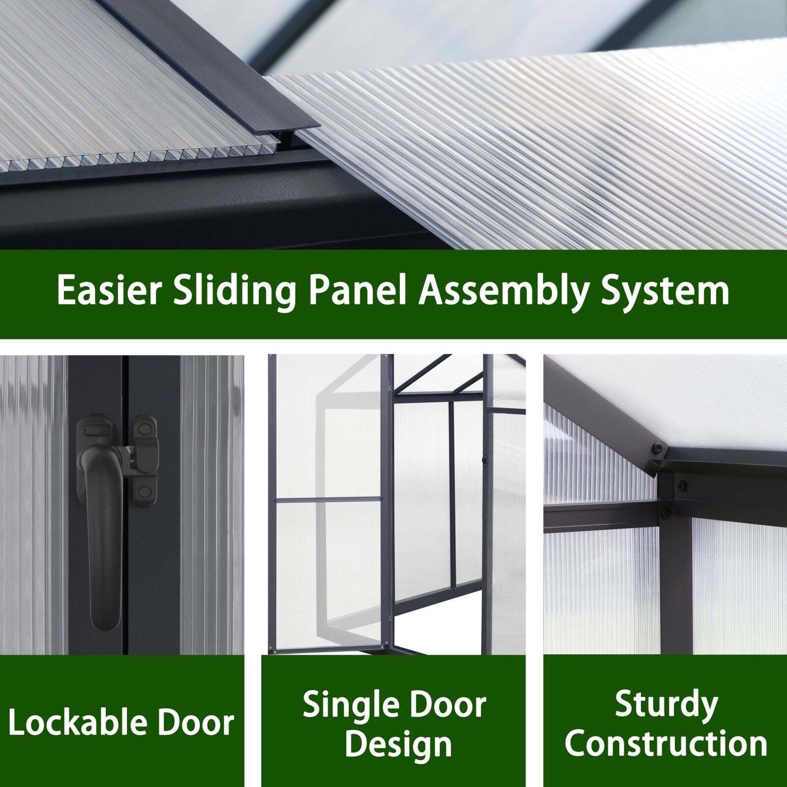 The aluminum greenhouse is equipped with UV-resistant PC sheets that not only protect your plants from harmful UV rays but also ensure their optimal growth. This feature helps your plants thrive all year round, regardless of your location.