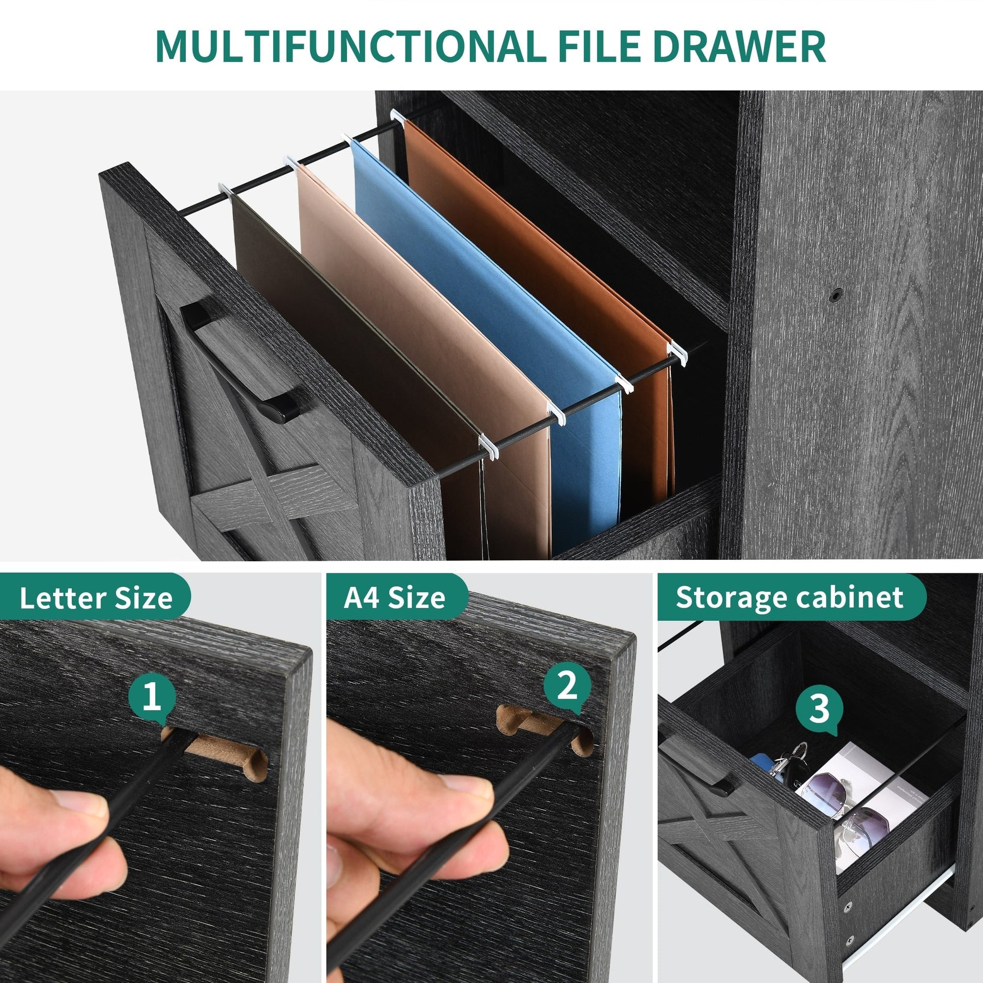 • 4. Keep your things organized and save space with this L-shaped computer desk. It has 1 file drawer with adjustable hanging bars for letter / A4 size documents, 1 storage cabinet, and 2 open storage shelves for storing books, magazines, files, letters, and other supplies.