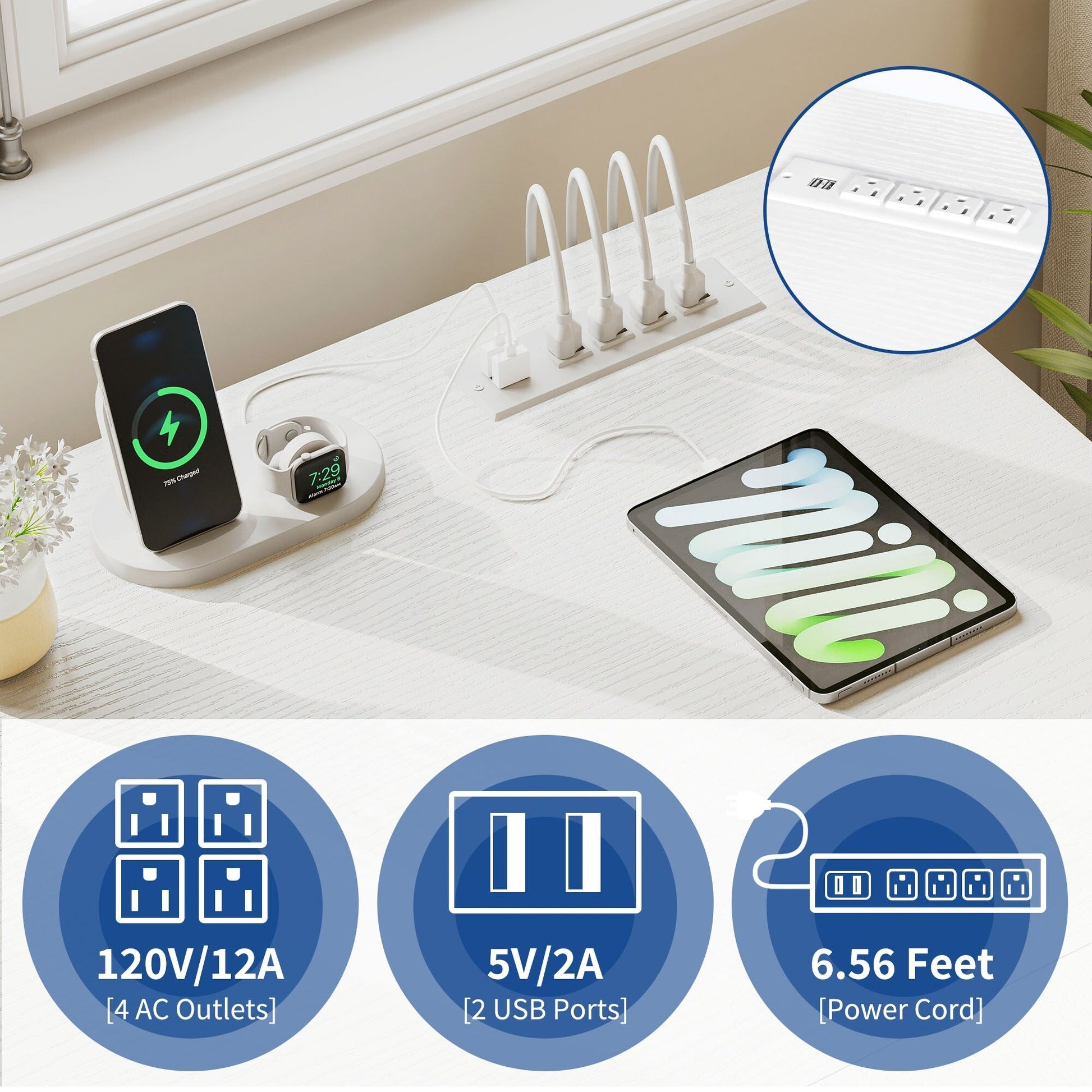 • 1. Charge your devices with ease with this L-shaped desk with drawers. It has 2 USB ports, 4 power outlets, and a 6.56ft power cord to keep your computer, laptop, phone, tablet, printer, and gaming gear plugged in and ready to use.