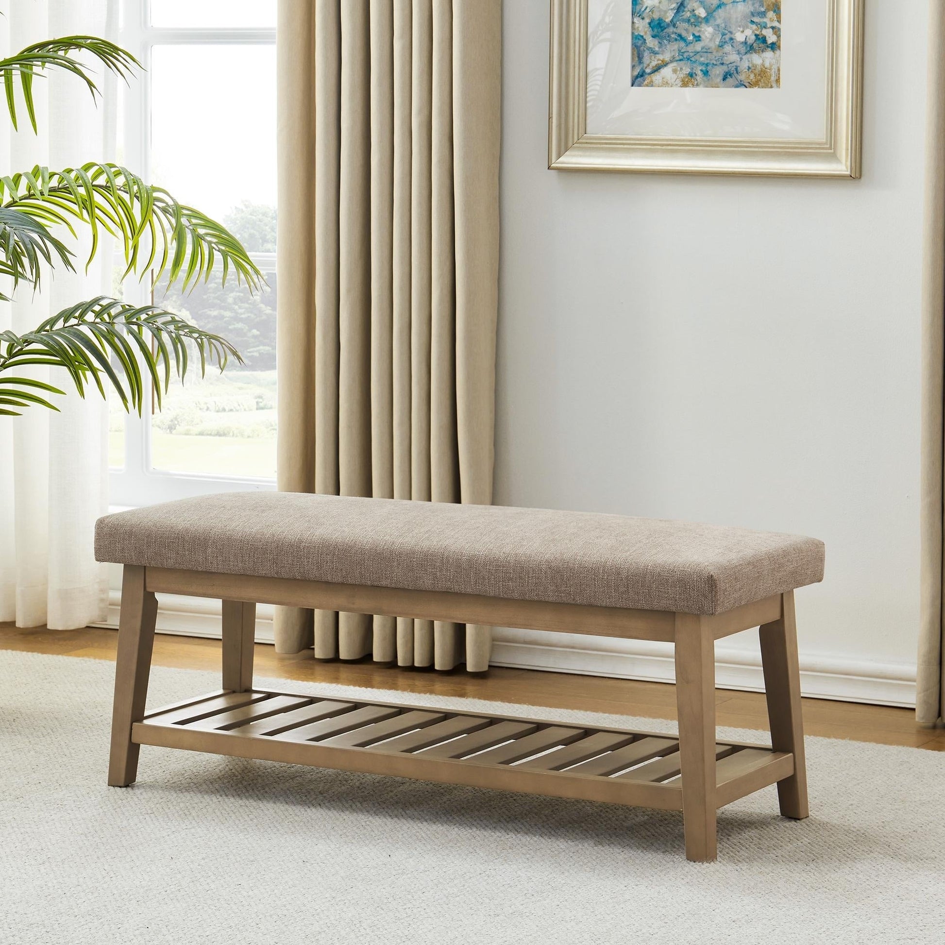 Create an inviting atmosphere in your entryway with a contemporary backless bench featuring a convenient storage shelf. Upholstered seat provides a cozy place to sit while putting on shoes. The lower slatted shelf is perfect for storing shoes and handbags, keeping them off the floor and maintaining a neat, organized space.
