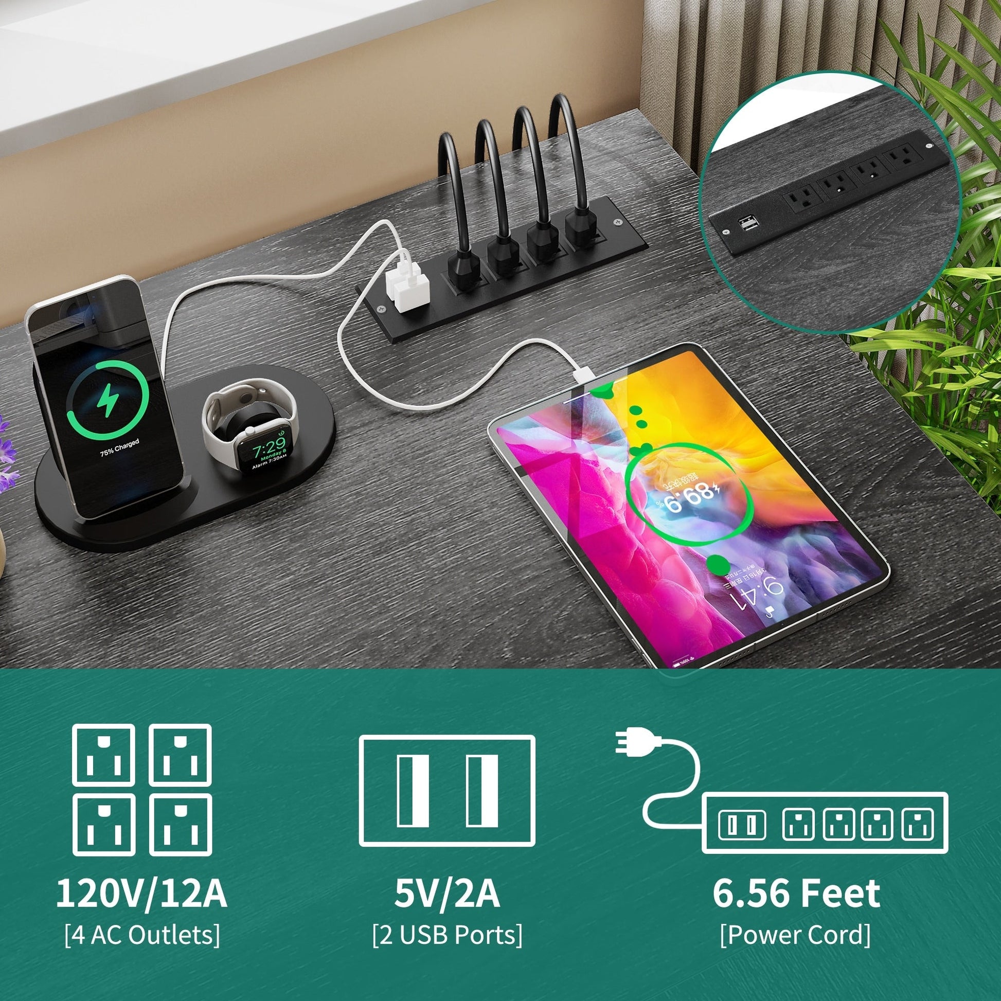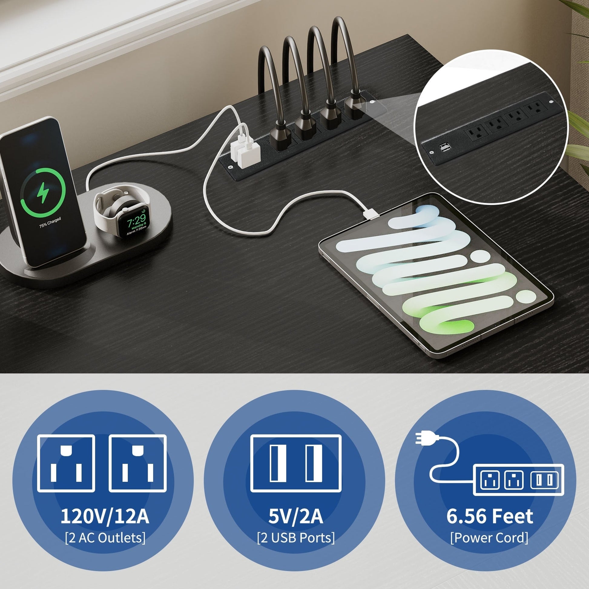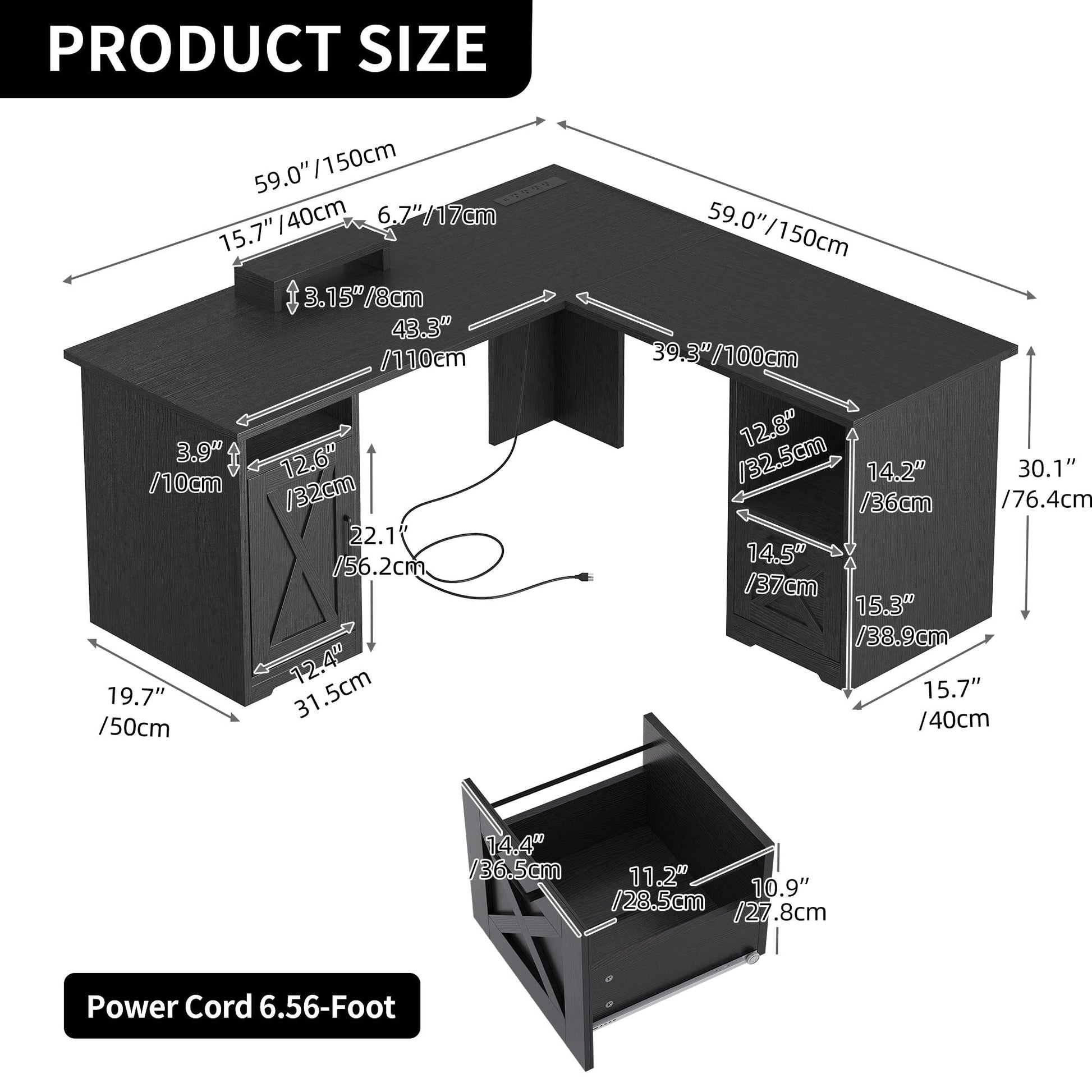 • 1. Charge your devices with ease with this L-shaped desk with drawers. It has 2 USB ports, 4 power outlets, and a 6.56ft power cord to keep your computer, laptop, phone, tablet, printer, and gaming gear plugged in and ready to use.